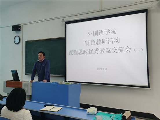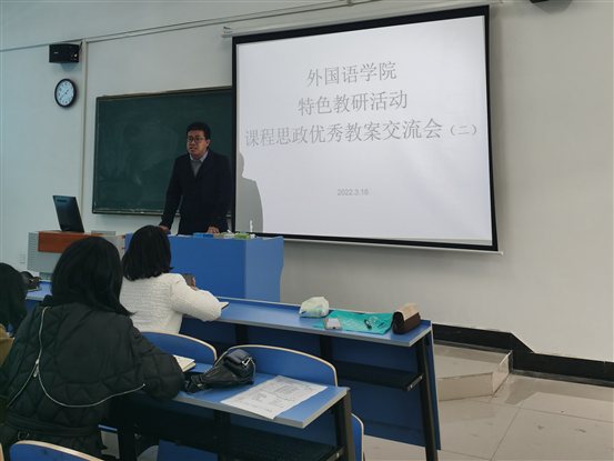 本网讯 为进一步推动外语教育教学改革,加强外语课程思政建设,外国语学院于3月18日下午在5402教室举办第二场特色教研室活动之课程思政优秀案例交流会,会议特邀马克思主义学院院长胡兆凌参与点评,会议由英语专业教研室主任曾晶主持,外国语学院全体教师参与观摩学习。