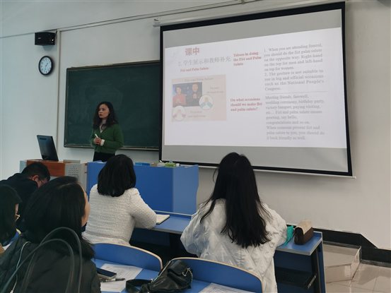 接着,担任《大学英语》课程的刘俊子老师分享的课程思政教学案例来自课文“Why Do Good Manners Matter?”,从课程的教学目标,教学过程,思政元素挖掘,教学效果等展开阐述。该课程设计以“输出驱动—输入促成”假设为指导,采用大学英语翻转课堂模式,在课前为学生提供相关语料,合理布置输出任务,以输出为驱动,创造学习“饥饿状态”,促进学生自主输入,通过课堂输出检验学生自主学习成果,教师给予反馈和总结,师生并重,教学相长。通过语言讲授让学生达到知识目标,通过课堂思辨达到能力目标,通过课程思政达到价值目标,并设计讲授法、任务法、讨论法来实现对应的目标,在细节处灵活调整,与其它方法穿插进行。