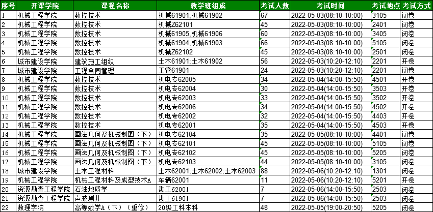 2021-2022学年第二学期期末考试安排(第11周)